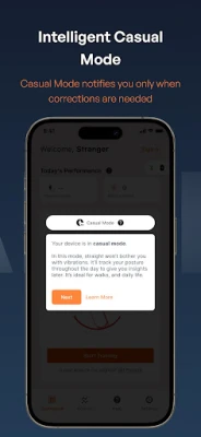 Dzięki StraightApp+ na iOS zyskujesz znacznie więcej niż tylko natychmiastową informację zwrotną. To Twoje centrum zarządzania postawą, gdzie możesz monitorować postępy w czasie rzeczywistym, dostosowywać ustawienia urządzenia Kodgem Straight do swoich preferencji oraz wykonywać specjalnie opracowane ćwiczenia wzmacniające mięśnie pleców i klatki piersiowej. Wykorzystaj potencjał zaawansowanej sztucznej inteligencji, która oferuje dwa inteligentne tryby pracy: Tryb Casual idealnie nadaje się do codziennego monitorowania postawy – wibracje pojawiają się tylko wtedy, gdy są naprawdę potrzebne, zapewniając komfort podczas spacerów i zwykłych aktywności. Natomiast Tryb Treningowy to Twój sprzymierzeniec w aktywnej poprawie postawy, szczególnie podczas siedzenia czy wykonywania statycznych zadań, oferując bardziej intensywne wsparcie.